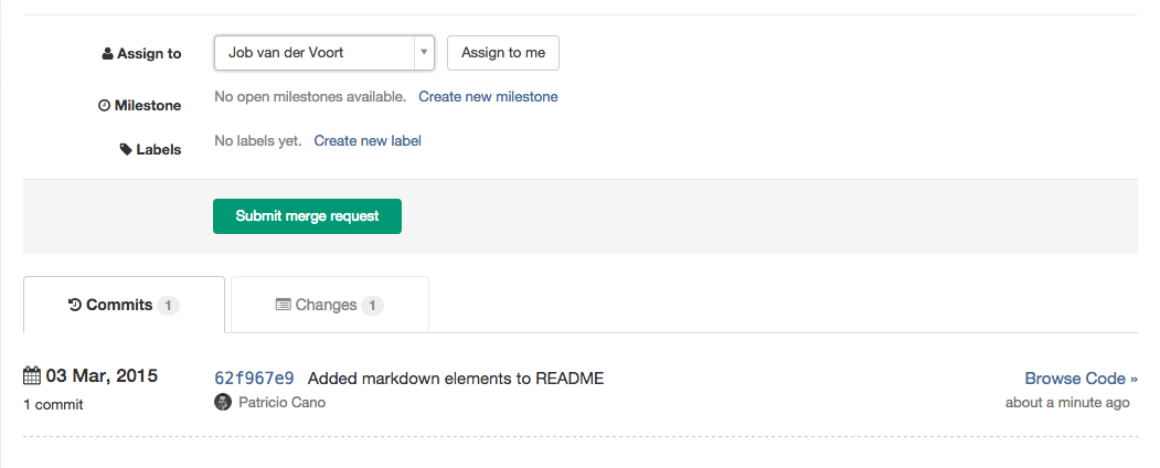 You can then assign the merge request to someone to have them review your changes. Upon pressing the 'Accept Merge Request' button, your changes will be added to the repository and branch you're merging into.