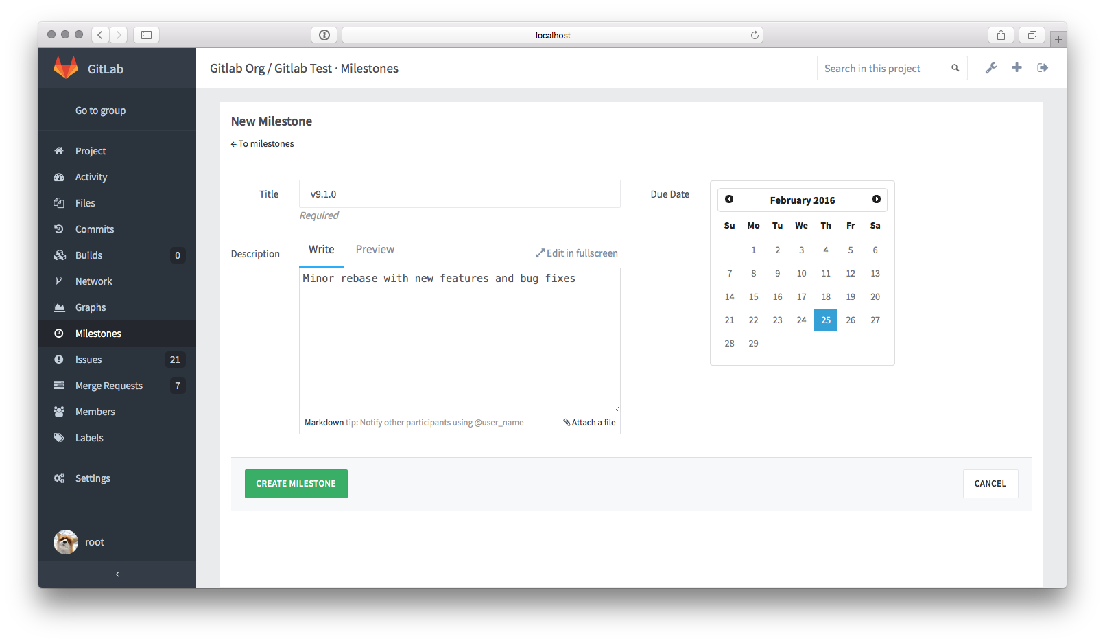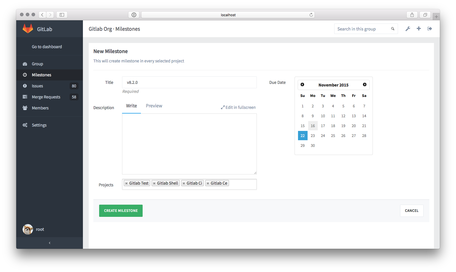 Milestones allow you to organize issues and merge requests into a cohesive group, optionally setting a due date. A common use is keeping track of an upcoming software version. Milestones are created per-project.